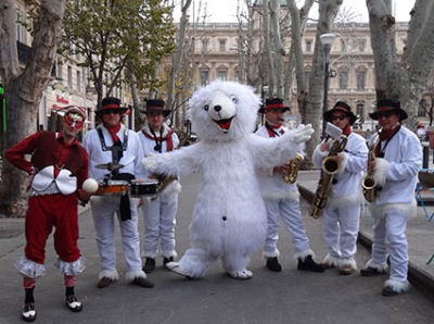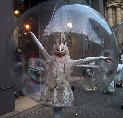 Deux licornes dans leurs sphères cristallines et une reine des glaces chanteuse déambulent en compagnie de musiciens aux allures de cosaques, d’ours polaires et d’un homme des neiges dirigeant un chariot sonore.