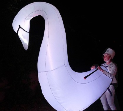 Un groupe de Cygnes rayonnant de blanc se déplace avec une tranquille majesté guidé par leurs meneuses en tenues d’apparat...